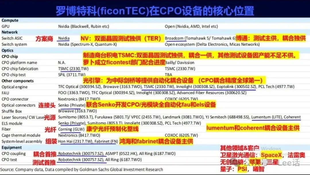根据高盛全球 CPO 产业链全景梳理,罗博特科(Robotechnik/ficonTEC)在 CPO 全环节占据无可替代的战略地位: