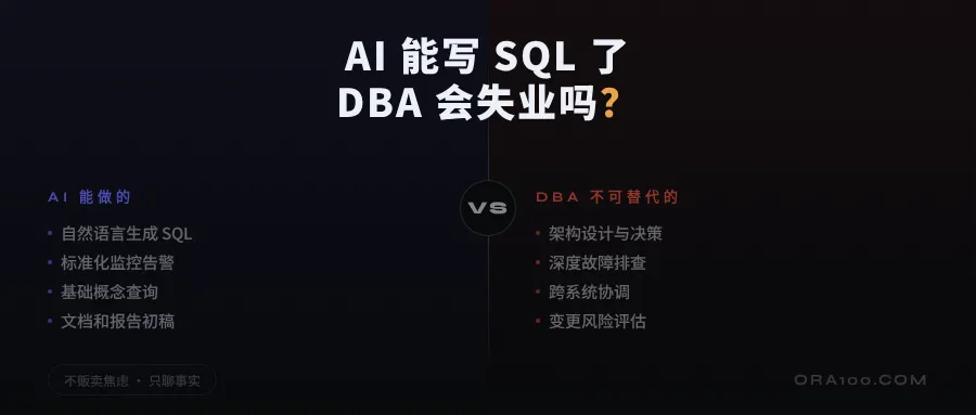 这意味着 DBA 的门槛其实在提高——以前会装库、会写 SQL 就能入行,以后这些基础活 AI 能干。你需要比 AI 懂得更深,才有不可替代性。