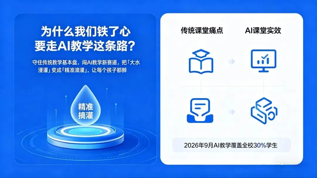 咱们开门见山,核心只聊一件事:今年9月,我们学校师资招聘的核心方向,就是AI教师;我们学校教学改革的核心抓手,就是AI智慧课堂。