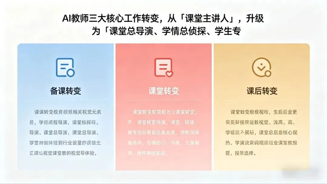 很多老师最关心的:当了AI教师,我到底要干什么?是不是上课不用讲,站在教室里发呆?完全不是。你的工作核心,会发生三个根本性的转变,从原来的“课堂主讲人”,变成“课堂的总导演、学情的总侦探、学生的专属私教”。