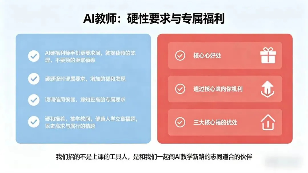 聊完了工作内容,我再跟大家说两句最实在的:一是我们对AI教师的硬性要求,二是你跟着我们干,能拿到的真真切切的好处。