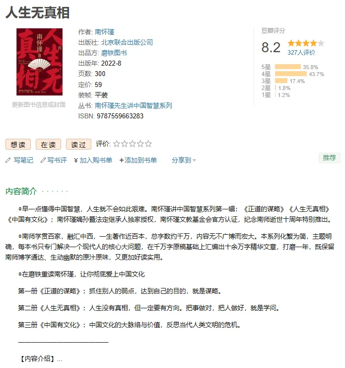 《人生无真相》PDF电子资料分享点击上方蓝字 关注我,获取更多电子书分享 | 本期书单电子版下载方式见文末 ~作者: 南怀瑾出版社: 北京联合出版公司出品方:磨铁图书出版年: 2022-8丛书:南怀瑾先生讲中国智慧系列ISBN: 9787559663283特别声明:图片和资料来源于网络,版权归原作者所有,若有侵权,请联系告知,删除相关信息本期书单电子书下载链接,点击文章末尾左下方阅读原文自动跳转。特别提醒:电子书仅供个人学习使用,链接随时失效,请及时转存至个人网盘哦~