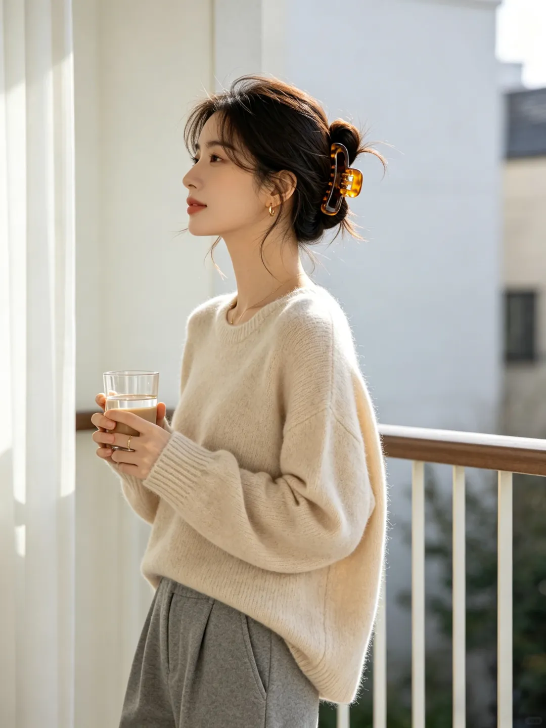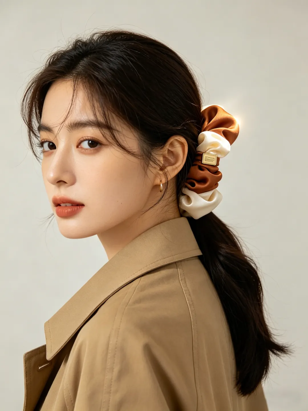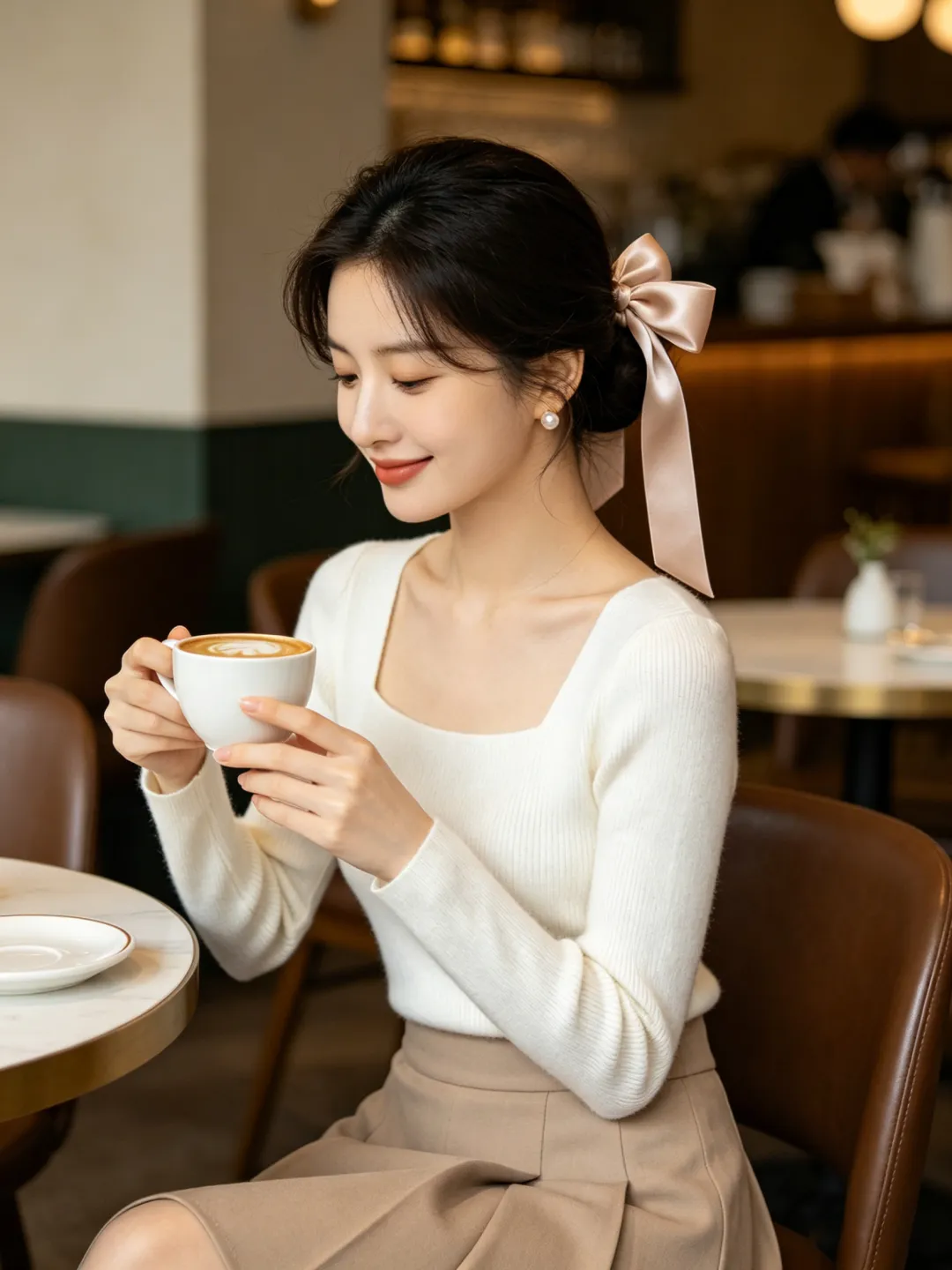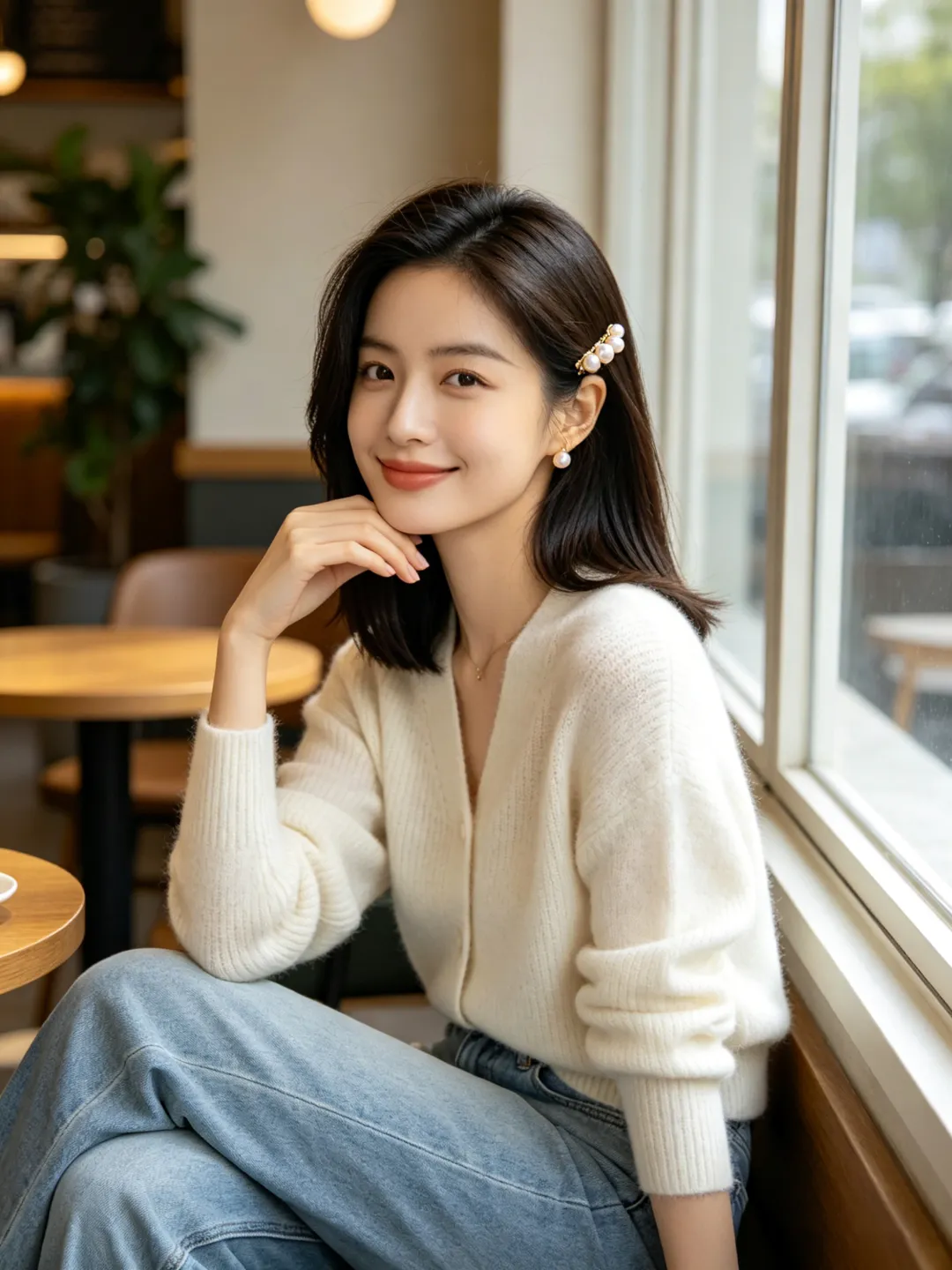 年轻东亚女性,气质温柔松弛。她坐在咖啡店窗边,侧身面向镜头,一手轻托下巴,自然微笑。发型为披肩直发,一侧头发别在耳后,露出耳朵上方的珍珠发夹——发夹为小巧的金属底座镶嵌4颗天然淡水珍珠,光泽温润,简约高级。穿搭:米白色针织开衫 + 浅蓝色直筒牛仔裤。自然光从窗户照入,光影柔和。浅景深,背景为咖啡店木质桌椅和绿植。图片比例3:4。年轻东亚女性,气质知性干练。她坐在书房或办公室的办公桌前,低头看文件或翻书,自然不经意。发型为半扎发,取上半部分头发用金属几何发夹固定——发夹为金色哑光金属,几何线条造型(方形/圆形/不规则形状),极简现代。穿搭:深灰色西装外套 + 白色圆领内搭 + 金色细项链。自然光从窗户照入,画面干净利落。构图采用半身,人物位于画面中心偏下。图片比例3:4。年轻东亚女性,气质干练优雅。她走在城市街道上,侧身回眸,自然抓拍。发型为高马尾或高丸子头,用丝绸发圈束发——发圈为酒红色真丝材质,光泽细腻。穿搭:卡其色长款风衣 + 白色T恤 + 深蓝色直筒西裤 + 白色运动鞋,肩背黑色托特包。自然光拍摄,上午光线柔和。构图采用全身,人物位于画面右侧三分线。图片比例3:4。年轻东亚女性,气质温柔甜美。她坐在下午茶餐厅或咖啡店,双手轻握咖啡杯,含笑低眸。发型为低马尾或低丸子头,在发绳处系一个缎带蝴蝶结发饰——蝴蝶结为香槟色或裸粉色丝绸缎带,大小适中(约6cm),垂下的丝带自然飘逸。穿搭:奶白色方领针织衫 + 浅咖色A字半身裙,佩戴小巧珍珠耳钉。柔和自然光,浅景深。构图采用半身,发饰位于画面上方黄金分割点。图片比例3:4。年轻东亚女性,气质慵懒松弛。她站在自家阳台或窗边,手中端着一杯水,目光望向远方。发型为盘发,用琥珀色或玳瑁色抓夹固定——抓夹为大号(约8-10cm),透明感琥珀色/玳瑁纹,复古有质感,几缕碎发自然垂落。穿搭:燕麦色宽松针织衫 + 灰色棉质休闲裤。自然光拍摄,温暖治愈。构图采用半身或七分身,人物位于画面中心。图片比例3:4。年轻东亚女性,气质精致优雅。她坐在餐厅或酒吧的卡座,侧身面向镜头,手持一杯红酒或香槟,含笑对视。发型为披肩卷发,佩戴水晶或锆石发箍——发箍为细金属底座(金色或银色),镶嵌一排透明水晶或锆石,光泽闪耀但不过分夸张。穿搭:黑色丝绒连衣裙或裸色缎面吊带裙,佩戴同系列水晶耳坠。暖黄色室内灯光,光影柔和有氛围感。构图采用半身,发饰在光线下微微闪烁。图片比例3:4。年轻东亚女性,气质文艺高雅。她站在艺术展或画廊的白墙前,侧身45度面向镜头,目光沉静。发型为低盘发髻,用法式金属发簪固定——发簪为银色的长条形(约12-15cm),簪头有简约的雕刻纹样(珍珠点缀)。穿搭:黑色高领针织衫 + 深灰色羊毛阔腿裤 + 黑色皮质托特包,佩戴银饰耳环。自然光或展馆内柔和灯光,画面干净高级。构图采用七分身,人物位于画面中心偏右。图片比例3:4。年轻东亚女性,气质浪漫松弛。她站在户外公园或花园中,侧身回眸大笑,自然抓拍。发型为侧编麻花辫或低马尾,用丝巾发带绑在发尾或缠在辫子上——丝巾为小方巾尺寸(约50x50cm),图案为法式波点/碎花/佩斯利纹样,颜色为砖红、墨绿或姜黄色,系成蝴蝶结或自然垂落。穿搭:白色棉麻衬衫裙 + 草编包 + 棕色凉鞋。阳光明媚的自然光,光影斑驳。构图采用全身或七分身,人物位于画面中心,发带随风轻飘。图片比例3:4。
