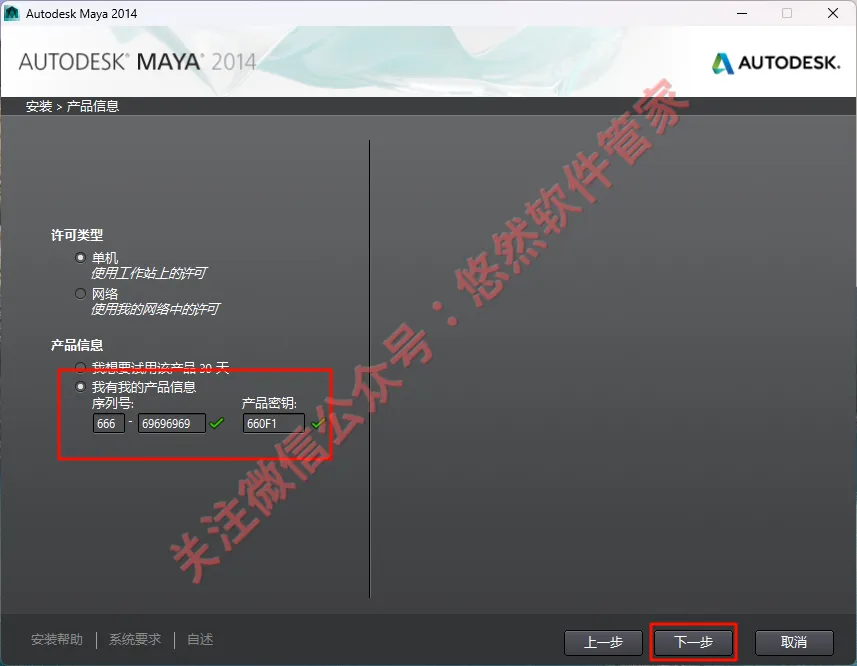 6.输入序列号【666-69696969】,产品密匙【660F1】,然后点击【下一步】