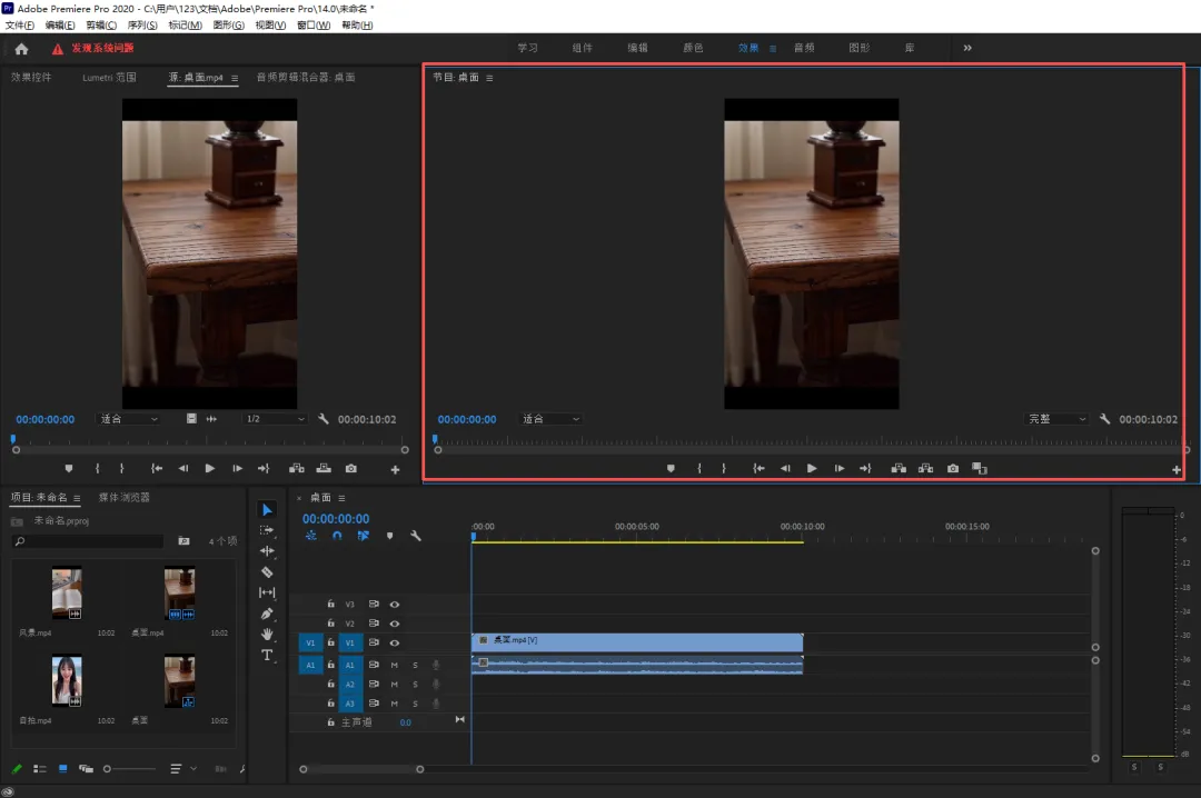 ③ 节目监视器:查看整个剪辑成品的效果,剪辑过程中实时预览,随时调整细节;