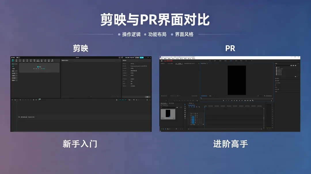 操作逻辑上,剪映是手机端拖拽即完成,主打快速出片;PR是电脑端专业操作,需要手动设置序列和轨道,剪辑更精准,适合进阶创作。
