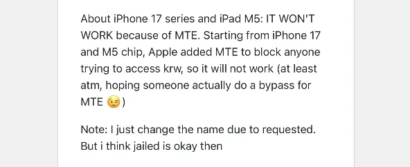 注意!iPhone 17 系列和 iPad M5 设备并不支持,由于 MTE 的缘故导致无法工作,因苹果添加MTE阻止任何试图访问Krw的人,只能等有缘人去突破绕过。