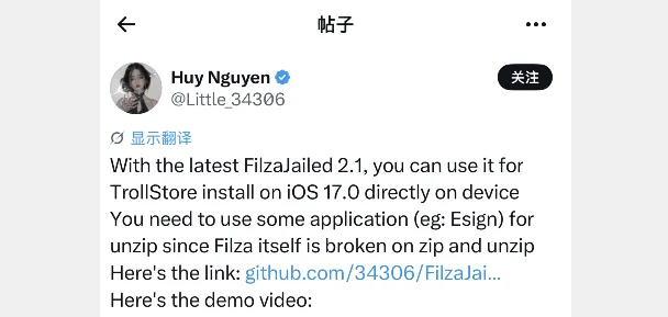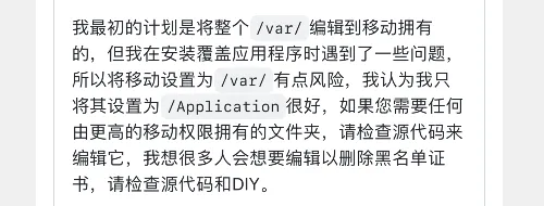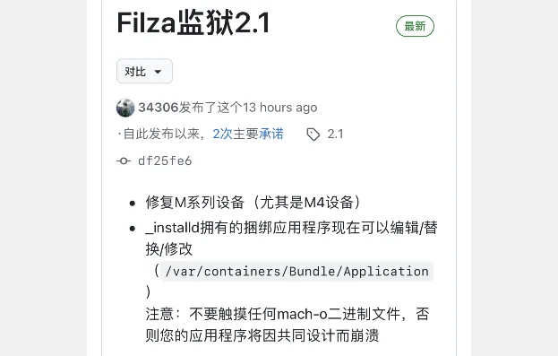 在4月18日下午时段,Little_34306 开发者针对 FlizaJailed 工具进行更新,推出 2.1 版本,主要修复 M 系统设备遇到问题,以及添加 application 应用目录替换支持,意味着可以改应用了,也就是说能安装巨魔了。