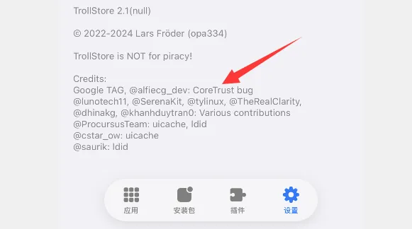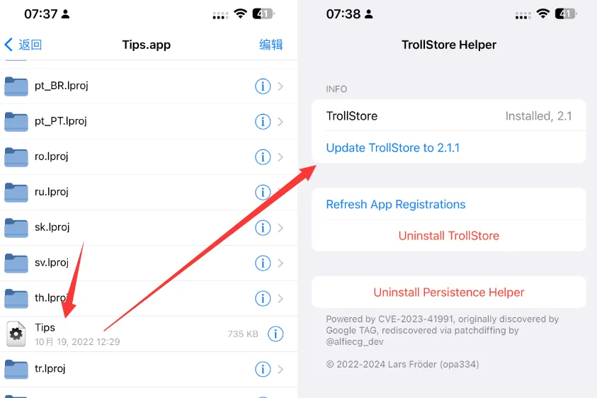 就拿 iOS 17.0 安装巨魔为例,可以在 application 目录找到“提示”App,然后覆盖安装巨魔的 Tips 文件,重新打开 Tips 文件即可看到安装 Trollstore 巨魔界面。