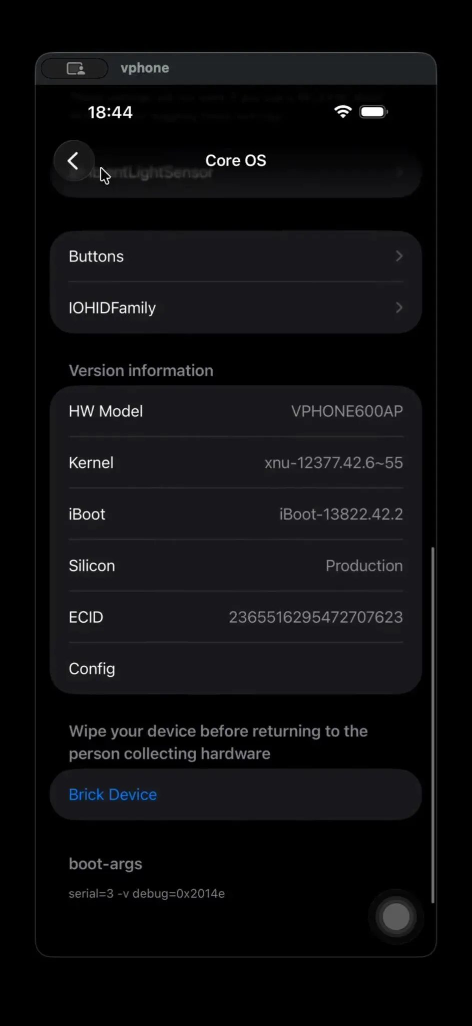 // 核心代码:VZMacHardwareModel *VPhoneCreateHardwareModel(void) {_VZMacHardwareModelDescriptor *desc =[[_VZMacHardwareModelDescriptor alloc] init];[desc setPlatformVersion:3]; // PV=3 是 iOS[desc setBoardID:0x90]; // vresearch101 板卡标识[desc setISA:2]; // ARM64return [VZMacHardwareModel _hardwareModelWithDescriptor:desc];}