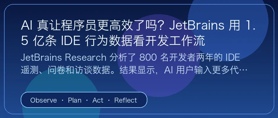 JetBrains Research 在 2026 年 4 月发了一篇研究文章《Understanding AI’s Impact on Developer Workflows》。这篇文章描述的是开发者在 IDE 里的真实行为,不是主观印象。