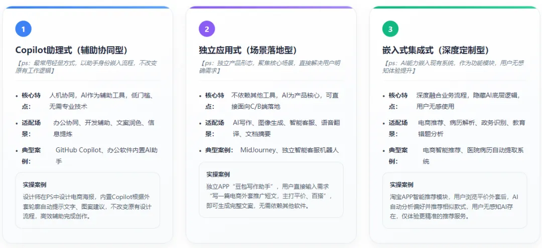 大模型的使用方式直接决定产品落地速度、成本与效果,核心分为三类,覆盖从轻量辅助到深度集成的全场景,适配不同业务需求,搭配实操案例帮助快速匹配自身场景:1.Copilot助理式 :最常用的轻量使用方式,以“助手”身份嵌入现有流程,不改变原有工作逻辑
