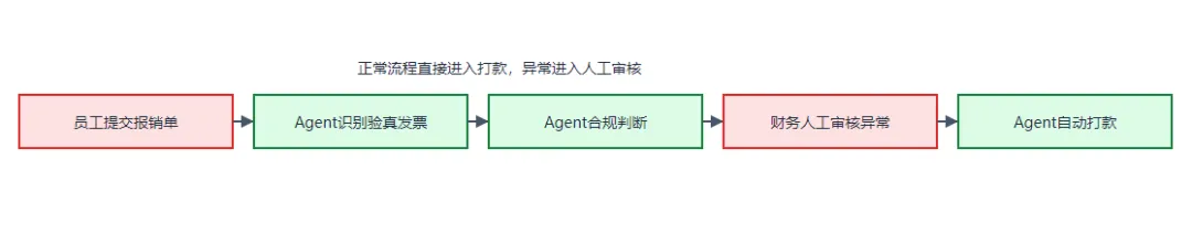 Workflow定义“做什么、怎么做、谁来做”的标准化流程,明确各步骤的先后顺序、执行主体(AI/人工)和验收标准;Agent作为流程中的核心执行主体,自主完成流程中AI可处理的步骤(如信息检索、内容生成、数据统计),人工仅负责关键审核、异常处理环节,既提升效率,又保障质量。实操案例1:财务报销审核场景:Workflow流程定义:1. 员工提交报销单(人工);2. Agent自动识别报销单信息(金额、发票真实性,AI);3. Agent判断报销是否符合公司规定(AI);4. 财务人员审核异常报销单(人工);5. Agent自动打款(AI)。Agent按Workflow流程自主完成信息识别、合规判断、打款步骤,人工仅审核异常情况,大幅减少财务人员工作量,提升报销审核效率。