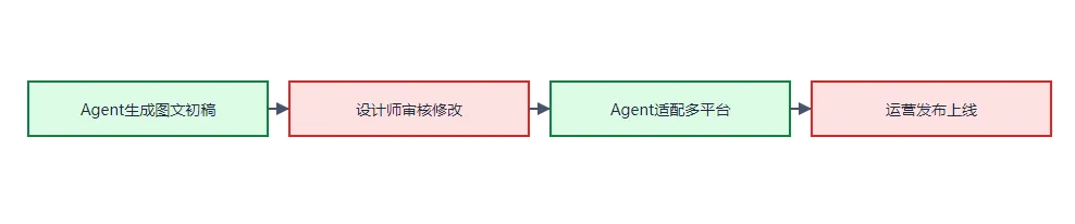 实操案例2:电商宣传图文生成场景:Workflow流程定义:1. AI(Agent)生成图文初稿(执行主体:AI);2. 设计师审核图文,修改细节(执行主体:人工);3. AI将修改后的图文适配不同平台(如抖音、小红书,执行主体:AI);4. 运营人员发布图文(执行主体:人工)。通过流程化串联,确保图文生成、审核、分发有序推进,避免遗漏环节,同时借助Agent的自主生成能力,提升设计效率。三、大模型的开发与落地模式