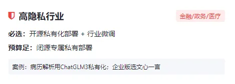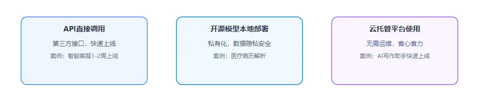 API直接调用【通过调用第三方大模型接口,快速实现功能,无需部署模型】:接入厂商大模型接口,快速上线,适合智能客服、写作助手、简单问答。案例:某小公司想做一款简单的智能客服工具,无需投入技术人力部署模型,直接调用文心一言API,快速实现“用户咨询订单问题→模型自动回复”的功能,上线周期仅1-2周,成本极低。开源模型本地部署【下载开源模型,在企业自有服务器/云端部署,实现数据私有化】:下载Llama/ChatGLM/Qwen等开源模型,私有化部署【模型部署在企业内部,数据不对外泄露】,数据更安全,适合有数据隐私需求的轻量场景。案例:某医疗公司想做一款病历解析工具,因涉及患者隐私,选择下载ChatGLM3开源模型,在企业内部服务器部署,所有病历数据均在内部流转,确保隐私安全,同时可根据医疗场景进行简单微调。托管平台使用【云厂商提供模型部署、运维服务,企业无需投入大量技术人力】:云厂商提供一键微调+部署,省心但灵活性一般,适合无技术团队、想快速落地的场景。案例:某初创公司想做一款AI写作助手,选择阿里云大模型托管平台,无需自己部署和运维模型,仅需上传少量行业数据进行微调,即可快速上线产品,节省技术人力成本。(二)深度定制开发模式