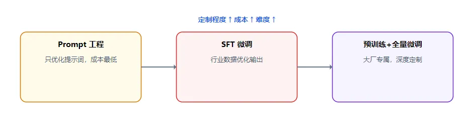Prompt工程【通过优化提示词,引导模型输出符合需求的内容,无需改动模型本身】:不改动模型,只优化提示词,成本最低,适配所有使用方式(含Agent的提示词优化、Workflow的步骤引导);核心作用是弥补模型“重度依赖提示词”的缺陷,提升输出准确性和贴合度。案例:用户想让模型生成电商宣传语,直接输入“写宣传语”,模型输出杂乱无章;通过Prompt工程优化提示词为“写一句电商外套宣传语,主打平价、百搭,语气活泼,适合年轻人”,模型输出贴合需求的内容“平价百搭款外套,年轻人的穿搭神器,闭眼冲不踩雷~”。SFT微调【有监督微调,用标注数据优化模型,让模型适配特定场景】:用行业数据小幅度优化输出风格与准确性,可用于优化Agent的决策能力、Workflow各步骤的执行精度,适配定制化场景。案例:某电商公司用Prompt工程优化后,模型生成的宣传语仍有部分不符合品牌风格(品牌主打简约风),于是用1000条标注好的“简约风电商宣传语”(输入:“外套宣传语”,标注答案:“简约百搭,平价实用”)对模型进行SFT微调,微调后模型生成的宣传语均贴合品牌简约风格。预训练+全量微调【从基础预训练到深度优化全流程开发,成本极高】:自研或深度定制,成本极高,适合大厂,可用于打造专属Agent(如企业专属业务Agent)、优化Workflow的核心执行逻辑。案例:阿里、腾讯等大厂,为适配自身电商、社交场景,基于基础预训练模型,用海量自有数据(电商交易数据、社交对话数据)进行全量微调,打造专属大模型和Agent,实现“千人千面”的推荐和服务,提升核心业务体验。四、大模型核心评估维度