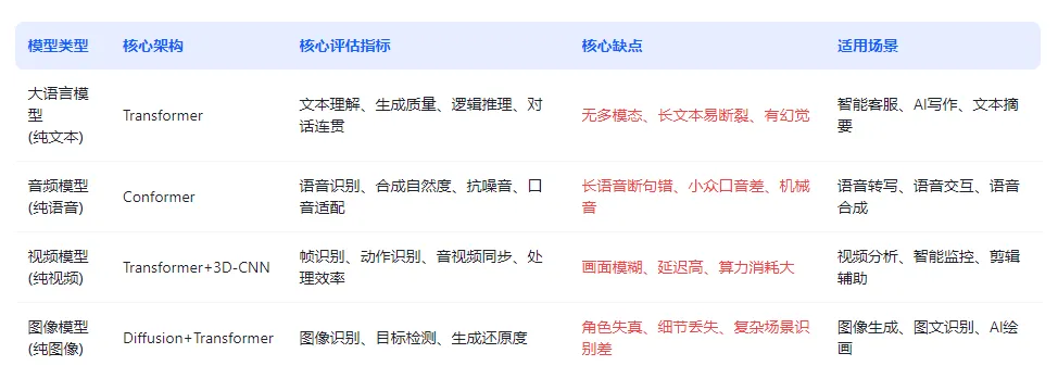 核心评估指标:包括语音识别准确率、语音合成自然度、噪音抗干扰能力、口音适配性,适配语音交互、语音转写、语音合成场景。核心缺点:长语音转写易断句错误、小众口音适配差,语音合成易出现机械音,复杂环境下识别精度大幅下降。案例:评估一款方言语音转写模型,在四川方言场景下,若能准确转写日常对话(如“这件外套好多钱”),无明显错别字,说明口音适配性强;若转写内容与语音偏差大、多错别字,说明适配性弱。(三)视频模型(纯视频模态):核心架构为Transformer+3D-CNN