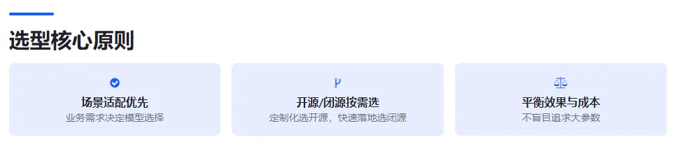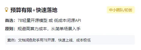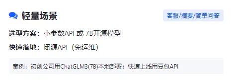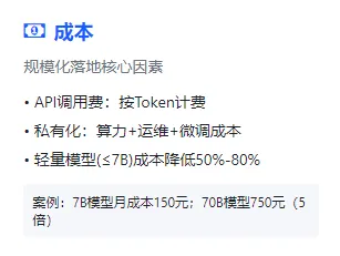 评估API调用费、私有化部署的算力成本、运维成本【模型部署后,日常维护、更新的成本】,平衡模型效果与落地性价比,适配不同预算场景。总之,参数越大、模态越复杂,成本呈指数级上升;轻量开源模型(7B及以下)可降低50%-80%的算力成本。