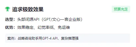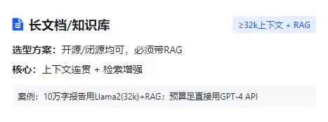 选型核心原则:场景适配优先、开源/闭源按需选择、平衡效果与成本,结合上述评估维度,明确不同场景下开源与闭源模型的选型逻辑轻量场景(客服/摘要/简单问答):选小参数API或7B开源模型;若追求快速落地、无需二次开发,可选择闭源模型API,无需投入人力部署运维。案例:某初创公司做“文案摘要助手”,仅需总结短文案,选用7B开源模型ChatGLM3,本地部署成本低;若想快速上线,直接调用豆包API,上线周期1周内。长文档/知识库场景:优先选≥32k上下文+RAG检索增强【RAG,通过检索外部知识库补充模型信息,减少幻觉】,开源与闭源均可;开源模型可自主部署优化,闭源模型无需关注部署细节,重点保障上下文连贯性。案例:某企业做“行业报告分析助手”,需处理10万字报告,选用32k上下文的开源模型Llama2,搭配RAG检索增强;若预算充足,直接调用GPT-4 API(32k上下文),无需部署。多模态产品(识图/图文生成):直接选支持多模态的基座,重点评估模态能力;开源模型(如Stable Diffusion)适合需要二次开发、定制化生成的场景,闭源模型(如MidJourney API)适合追求高效果、快速落地、无需定制的场景。案例:某设计公司做“电商图文生成工具”,需要定制品牌风格,选用开源模型Stable Diffusion二次开发;若无需定制,直接调用MidJourney API,快速生成高质量图文。单模态产品(纯图像/纯语音/纯视频):聚焦对应模态专项评估,结合架构特点选型——图像生成选Diffusion架构,优先开源;语音交互选Conformer架构,闭源适合通用场景,开源适合口音适配;视频处理选Transformer+3D-CNN架构,开源适合二次开发,闭源适合快速落地。案例:某公司做“方言语音转写工具”,适配四川方言,选用Conformer架构的开源语音模型二次开发;若做通用转写工具,直接调用百度语音API(闭源)。高隐私行业(金融/政务/医疗):优先选开源模型私有化部署,搭配行业微调;若预算充足、无需二次开发,可选择闭源模型专属私有部署服务,确保合规与数据安全。案例:某医院做“病历解析工具”,选用开源模型ChatGLM3私有化部署,搭配医疗数据微调;若预算充足,选用文心一言企业版私有部署服务。追求极致效果但预算充足:选用头部闭源大模型API(如GPT系列、文心一言企业版),节省开发与运维成本,效果更稳定、幻觉率更低。案例:某大厂做“企业战略咨询助手”,需要复杂逻辑推理,选用GPT-4 API,虽成本高,但效果稳定,无需大量技术人力维护。需要二次开发/定制化场景:优先选开源模型(如Llama2、ChatGLM3、Stable Diffusion),可修改源代码、深度微调,适配企业专属业务场景。案例:某电商公司做“专属品牌宣传语生成工具”,选用开源模型Llama2,用自有宣传语文本微调,定制生成风格。预算有限、快速落地场景:优先选轻量开源模型(7B参数级),或调用低成本闭源模型API,规避高算力、高参数带来的成本压力;Agent与Workflow落地从简单场景入手,无需追求复杂自主能力。案例:某小公司预算有限,做“办公文档润色助手”,选用7B开源模型,无需复杂微调,快速上线,成本可控。AI产品经理在工作中落地大模型,核心是“先明确场景需求,再选使用方式,用评估维度把关,按选型指南落地”,无需纠结底层技术,重点关注“场景适配、效果达标、成本可控”,同时结合Agent与Workflow的协同逻辑,就能将大模型真正落地成可用、好用的产品。