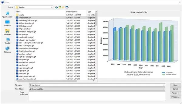 八、【完全兼容】无缝可视化和分析来自多个来源的数据。Grapher 本身可以读取多种文件格式,包括 ACCDB、DBF 和 XLSX。Grapher 还支持最流行的导出格式。在 Grapher 中轻松管理您的所有数据