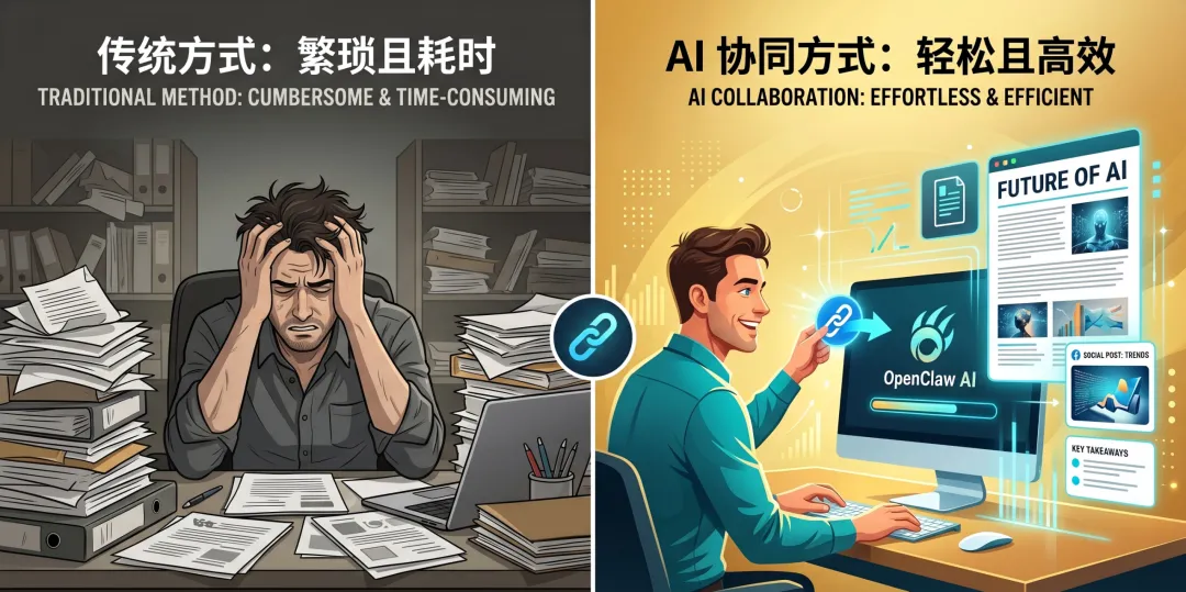 但如果用 OpenClaw 的话,你只需要做一件事,特别简单:扔一个链接进去就完事了。