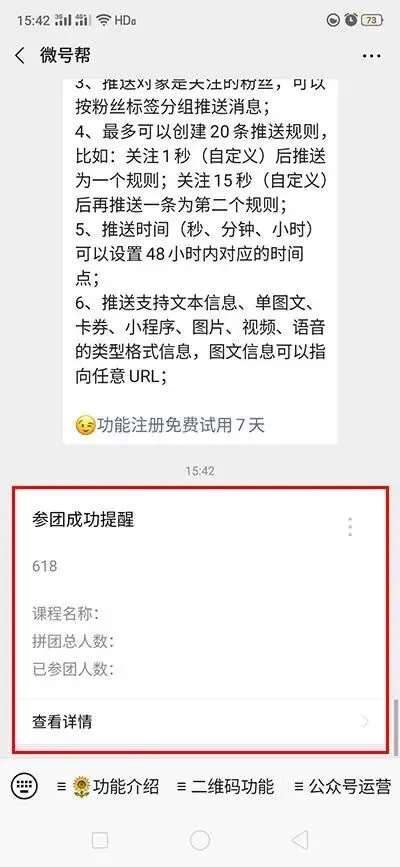6、微信公众号群发模板消息功能,在微信上的演示效果。现微号帮平台注册用户/登录,微信扫码授权添加公众号,立即免费试用7天,试用期间所有功能开放,测试满意后再在线支付开通;不满意也可以随时在公众号平台取消授权给微号帮。