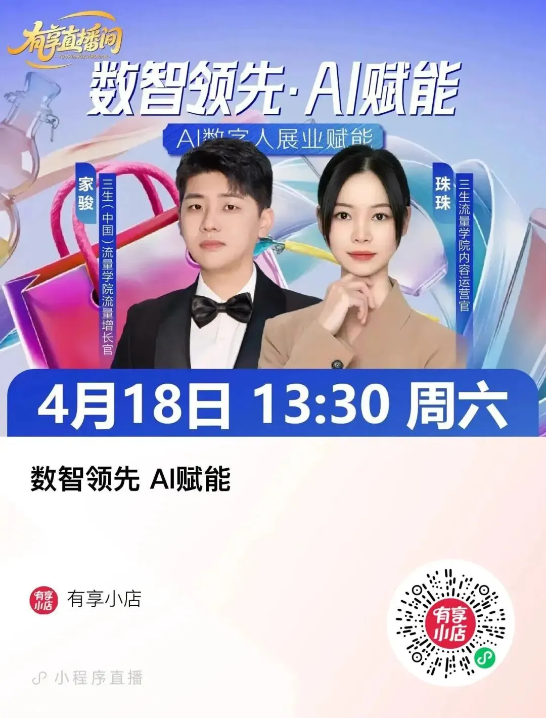 【今日直播】数智领先.AI赋能🔥【今日下午直播预告】⏰直播时间:4月18日 周六 13:30✨直播主题:数智领先 · AI赋能本次直播间干货满满拆解AI数字人展业实用方法分享线上流量增长思路、个人事业轻创业干货全程无套路纯分享,新手也能听懂 识别【有享小店】二维码直播间一起解锁AI时代的线上成长新方式!