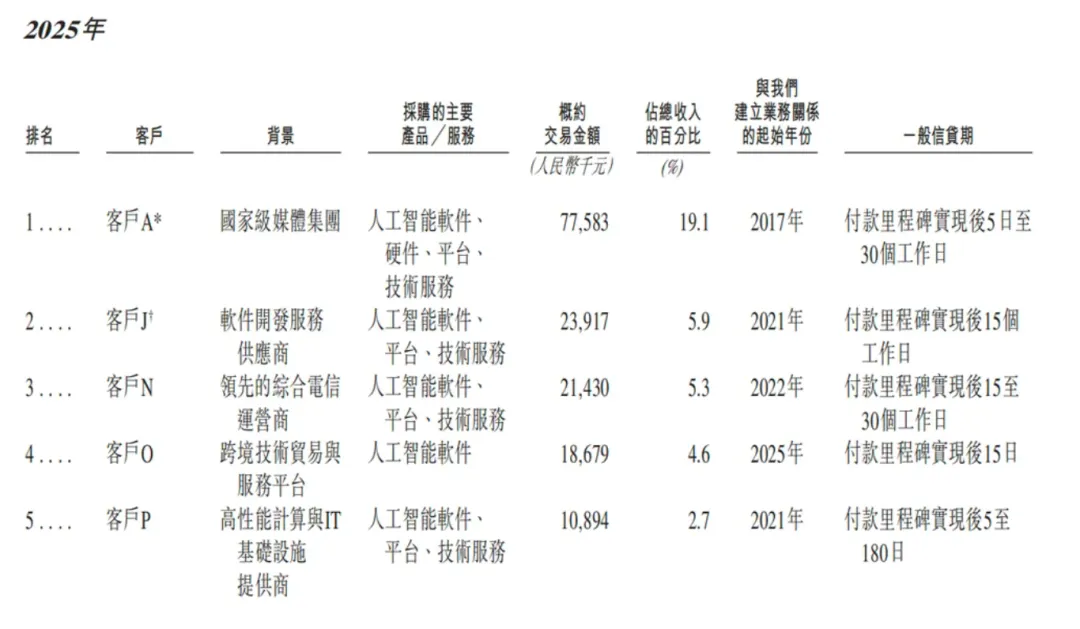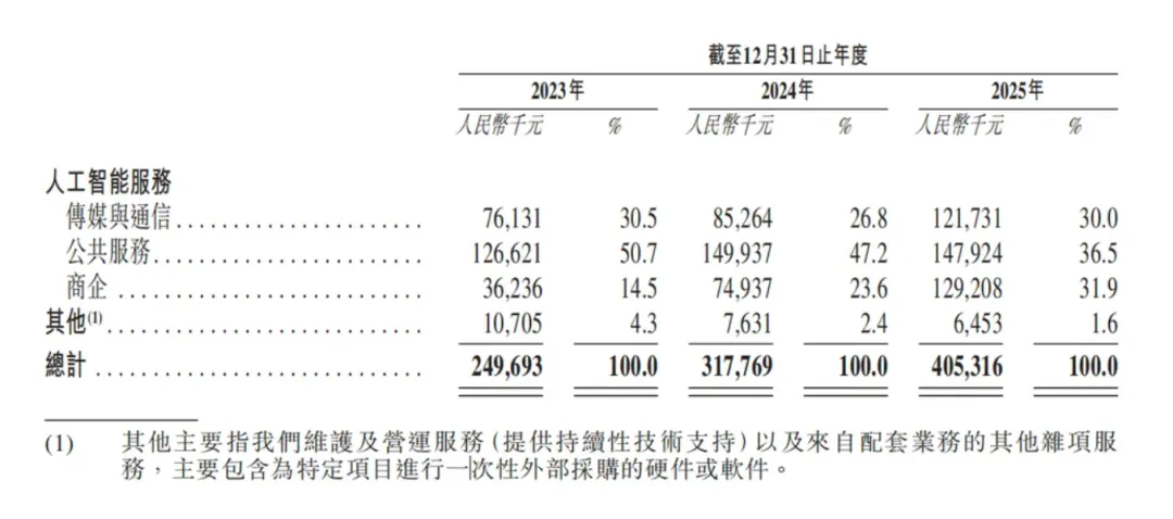 2023年至2025年,公司收入主要来自人工智能服务在传媒与通信、公共服务、商企等领域的应用;其中,2025年传媒与通信收入1.217亿元,公共服务收入1.479亿元,商企收入1.292亿元。