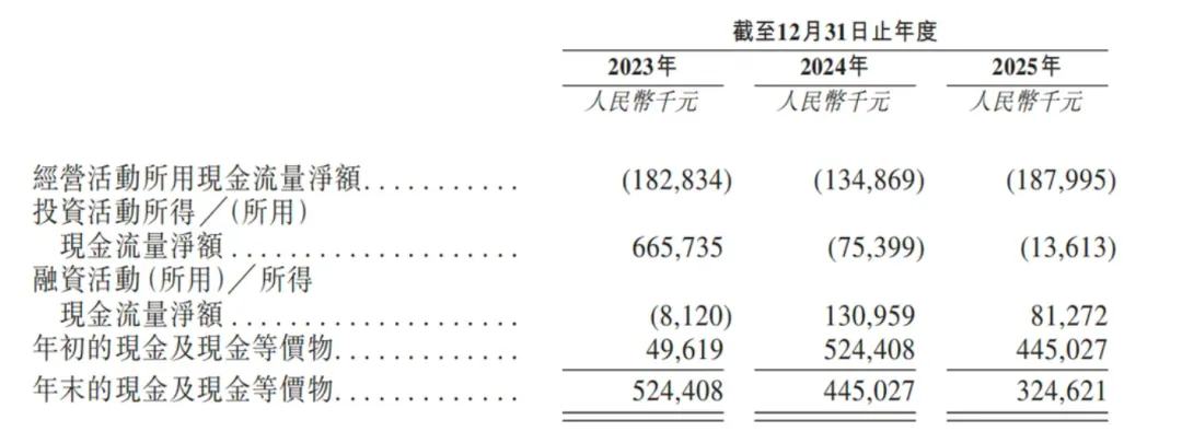 据其提交的财报显示,2023年、2024年及2025年,中科闻歌经营活动现金流量净额分别为-1.828亿元、-1.349亿元和-1.880亿元。公司也提示,经营活动现金流出主要与提供人工智能服务、研发、销售及市场推广活动、行政管理产生的大量营运成本及经营费用有关。
