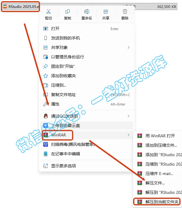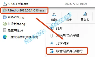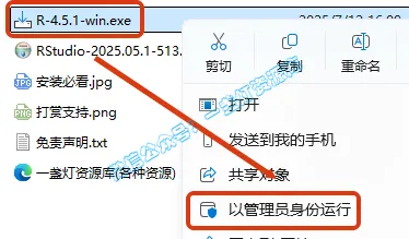 12.返回刚刚解压的文件夹,鼠标右键【RStudio-2025.05.0-496.exe】选择【以管理员身份运行】