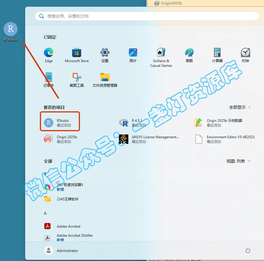17.点击【开始】菜单栏,找到【RStudio】软件,鼠标左键拖拽到桌面上即可创建桌面快捷方式