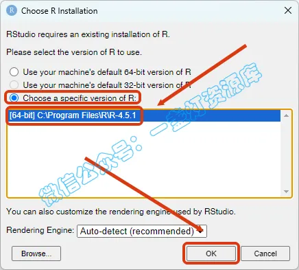 19.选择【Choose a specificversion of R】和【R-4.5.1】,点击【OK】