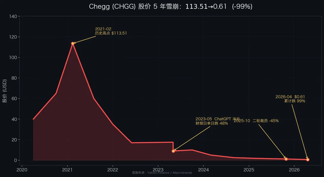 • 2021 年 2 月:股价 $113.51,市值 140 亿 • 2023 年 5 月 2 日:财报会承认「ChatGPT 正在伤害我们的业务」——单日跌 48% • 2025 年 10 月:第二轮裁员砍 45%,388 人 • 2026 年至今:从股价最高点下来跌了 99%,9 位分析师零 Buy 评级