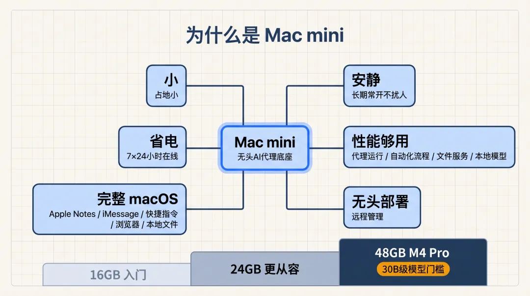 Apple Silicon 这几代下来,Mac mini 已经很适合做一台常开机器。M4 级别的性能,拿来托管 AI 代理、跑自动化流程、做文件服务,甚至顺手带一个本地模型,都不算吃力。16GB 内存可以作为入门;如果你还想同时跑本地模型,24GB 会从容很多;再往上,48GB 的 M4 Pro 已经能碰到 30B 级模型的门槛。