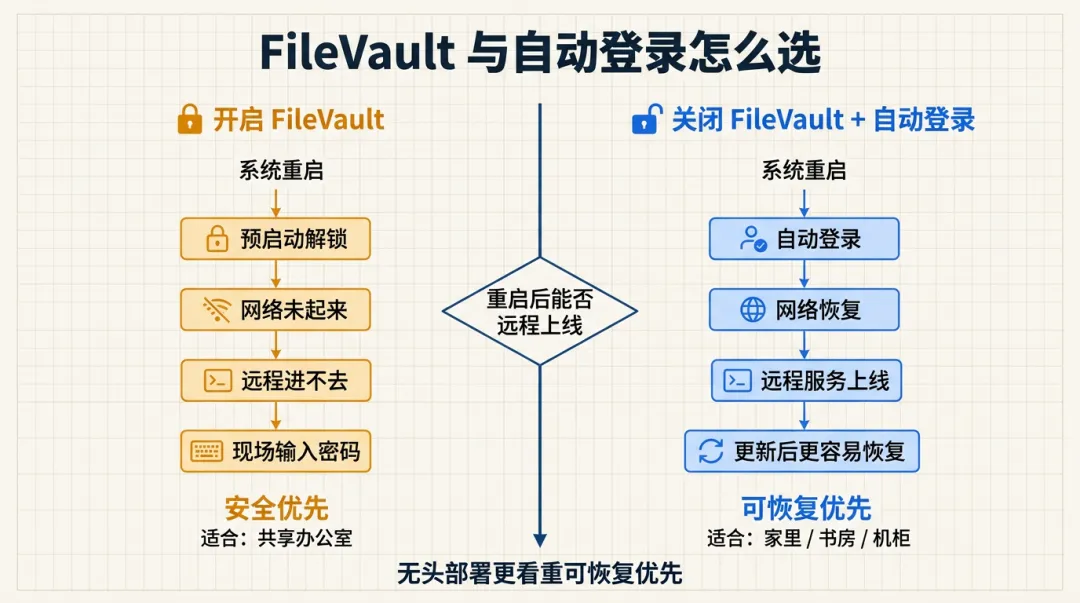 FileVault 是 macOS 的全盘加密。安全性当然更高,但对无头 Mac 来说,它有个很现实的问题:机器一旦重启,会先停在预启动解锁界面;这时候网络还没起来,你也就没法远程连进去。
