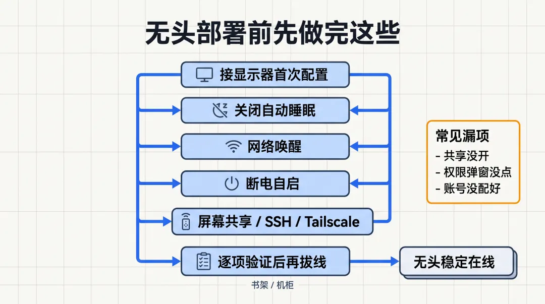 远程共享、SSH、Tailscale 这类服务,最好都在接着显示器的时候一次配好、验证好。别等机器塞进柜子里,才发现共享没开、账号没配、权限弹窗没点。