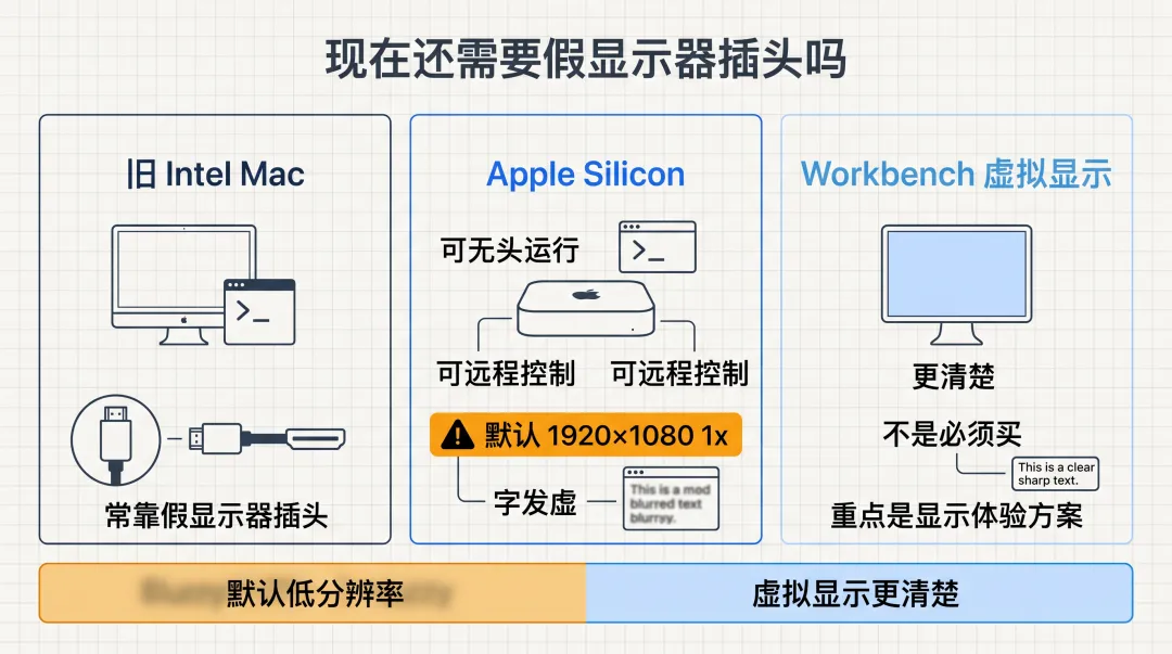 以前的 Intel Mac 确实经常要靠 HDMI dummy plug 这类“假显示器插头”骗系统输出正常分辨率,否则远程桌面会糊得很难用。Apple Silicon 时代,这个问题已经轻很多了。M1 之后的 Mac mini 就算不接显示器,也能正常跑,也能被远程控制。