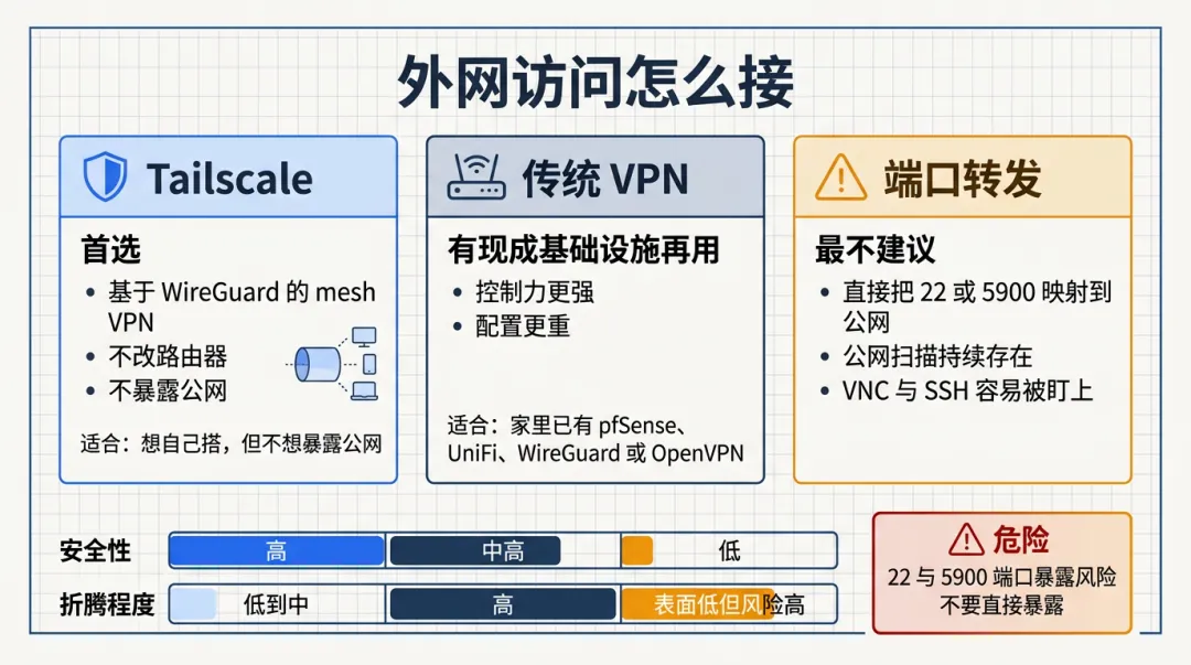 简单说,能用 Tailscale 或 VPN 解决的事,就别靠端口转发硬扛。