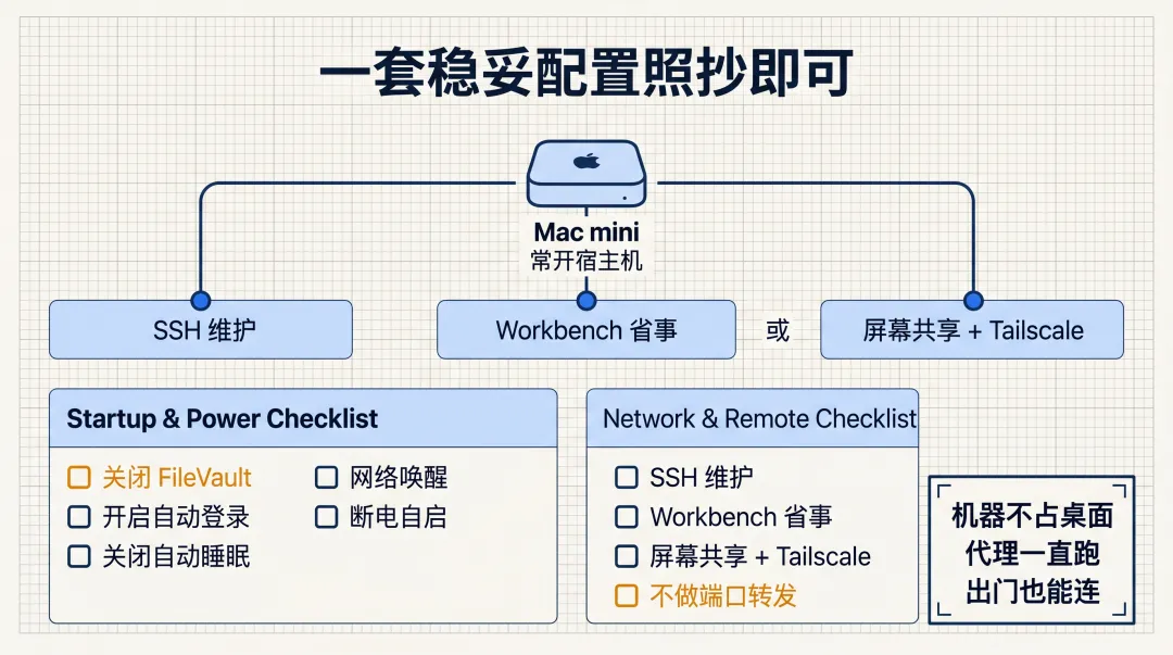 这样配出来的结果很朴素,但很实用:机器不用占桌面,代理能一直跑,你出门也能连,重启后大概率还能自己恢复。