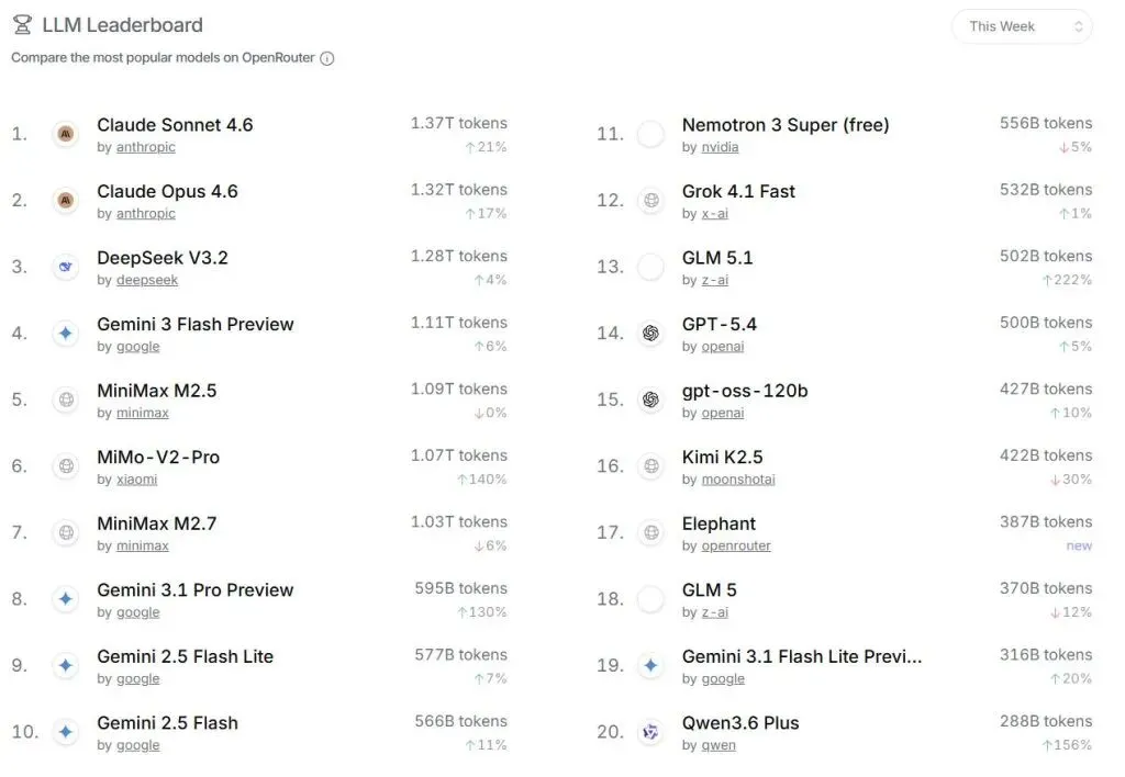 这是根据OpenRouter数据出品的榜单产品,榜单分为AI大模型和应用,统计时间为本周数据,发现AI每周末整理发布。