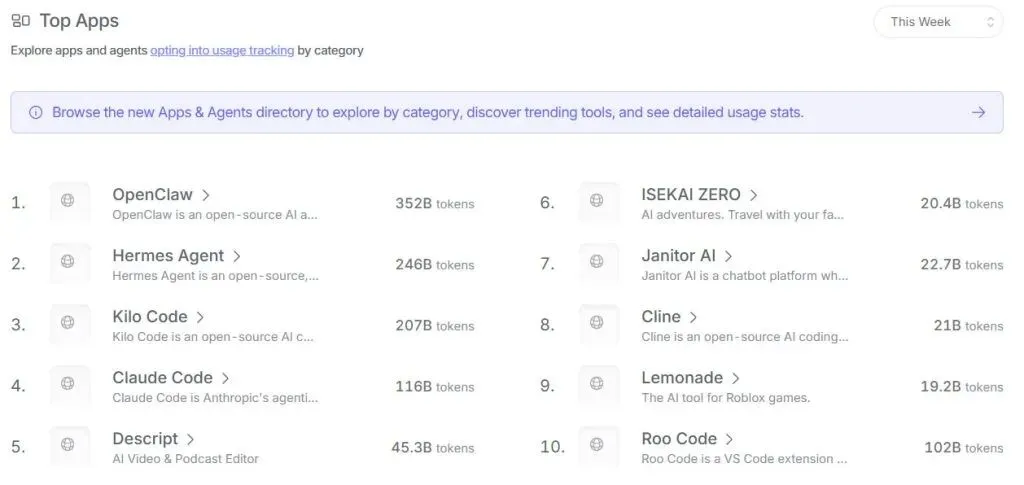 应用榜前三分别为OpenClaw 、Hermes Agent 、Kilo Code 。