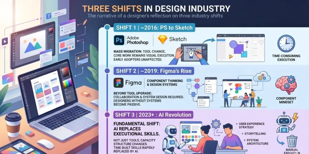 2016年前后,设计师从PS大规模迁移到Sketch。工具换了,但核心工作没变——依然是视觉执行为主。跟上工具的人,基本没有受到冲击。
