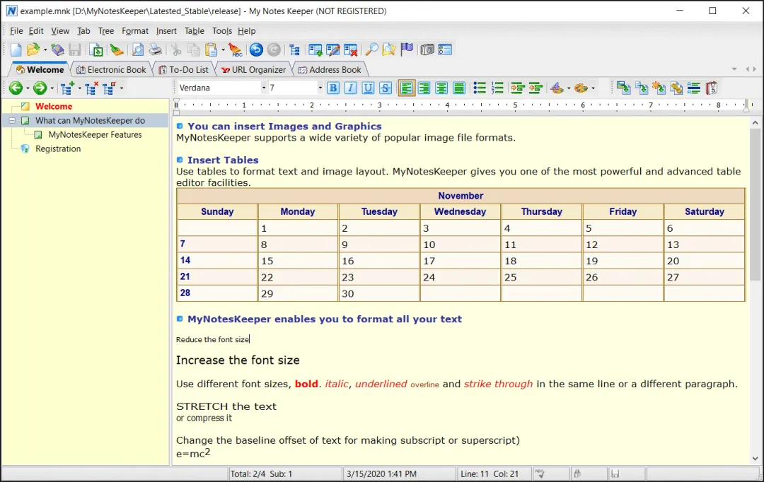 My Notes Keeper 是一款体积小巧、功能齐全的个人数据管理软件,类似 myBase 和 eDiary,它使用便捷,操作与WORD相似,不需要技术含量,新手使用者在 几分钟内即可熟练操作。它允许你把你所有的笔记和信息存储在一个易于使用的大纲中,在那里你可以很快找到你需要的东西。支持用文字、表格等形式来制作管理系统,它的密码保护功能使你能用它来管理你的工作文档、学习资料等一系列的个人的私密数据,除此之外,它甚至还能制作电子书。