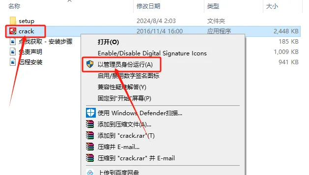 9.返回到解压的文件夹中,鼠标右击【crack】注册机,选择【以管理员身份运行】。
