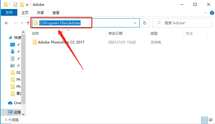 20.因为我们的ps cc 2017默认安装在系统C盘,如果你想要更改路径,可继续下面的操作。如下图所示,打开C盘的安装路径文件夹C:\Program Files\Adobe。