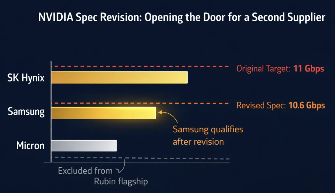 上篇点到了 NVIDIA 把 HBM4 规格从 11Gbps 降到 10.6Gbps 这件事。表面上这只是一次技术妥协——标准太严做不出来,客户松口一档。但背后是 NVIDIA 对整个 HBM 供应链权力结构的一次主动调整。