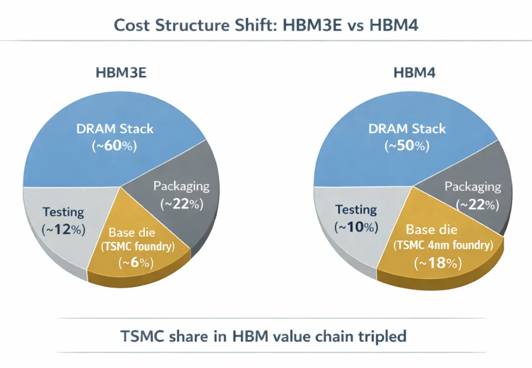 前面讲过 HBM4 的 base die 不再是简单转接板,必须是一颗台积电 4nm 的逻辑芯片。这个变化的直接后果是:单颗 HBM 的成本结构里,台积电的代工费占比在上升。HBM3E 时代,base die 成本占单颗 HBM 的 5-8%。HBM4 时代,这个比例上升到 15-20%。三家内存厂每卖出一颗 HBM4,都要给台积电交一份代工费。