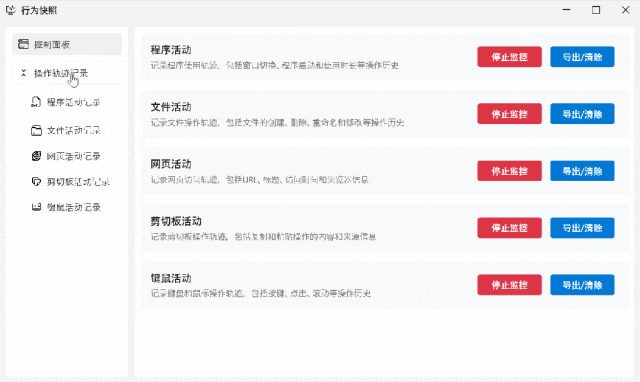 首先要带大家认识的是行为快照。这是一款真正意义上的系统级监控神器,它的核心逻辑在于将原本隐匿在系统后台的操作转化为肉眼可见的数据流。它的监控范围极其广泛,涵盖了程序运行轨迹、文件读写活动、网页浏览记录,甚至连剪切板的更迭和键鼠的动态都能被一一捕捉。