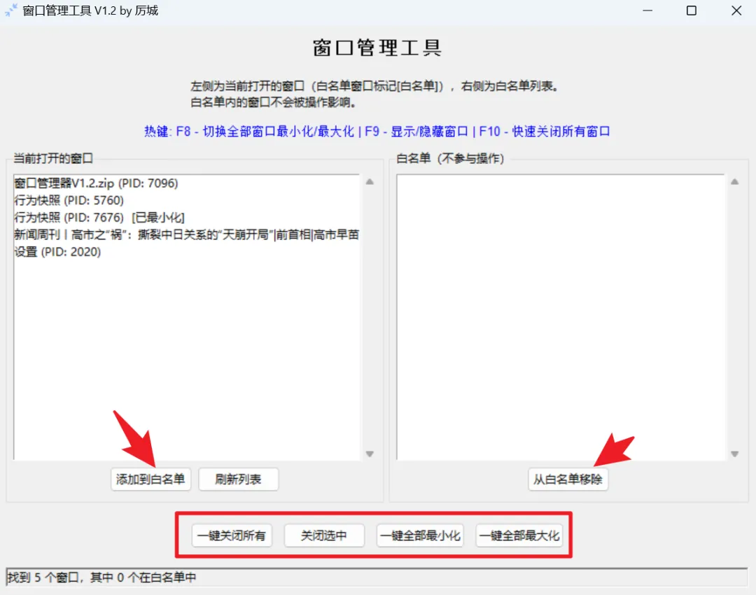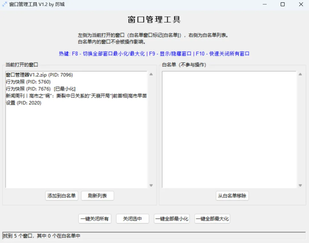 软件的左侧会自动列出当前所有活跃的窗口,而右侧则是人性化的“白名单”区。如果你希望在清理桌面时保留音乐播放器或某些后台进程,只需将其加入白名单,剩下的事情就简单了:点击【一键关闭所有】,那些冗余的窗口会像退潮一样瞬间消失,帮你实现“秒速下班”。除了彻底关闭,它还提供了【一键全最小化】和【一键全最大化】的快捷操作,非常适合在多任务切换时快速找回视觉焦点。