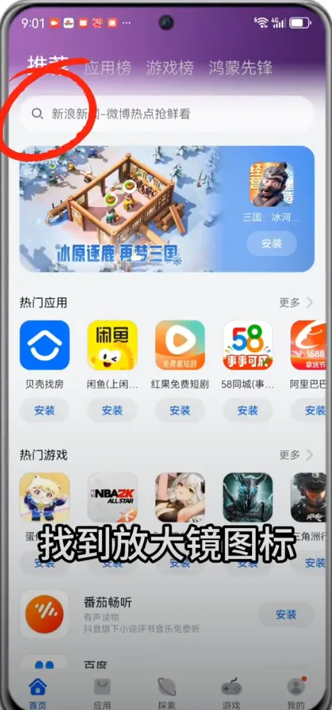 二、在页面最顶部,找到一个放大镜图标,点击它